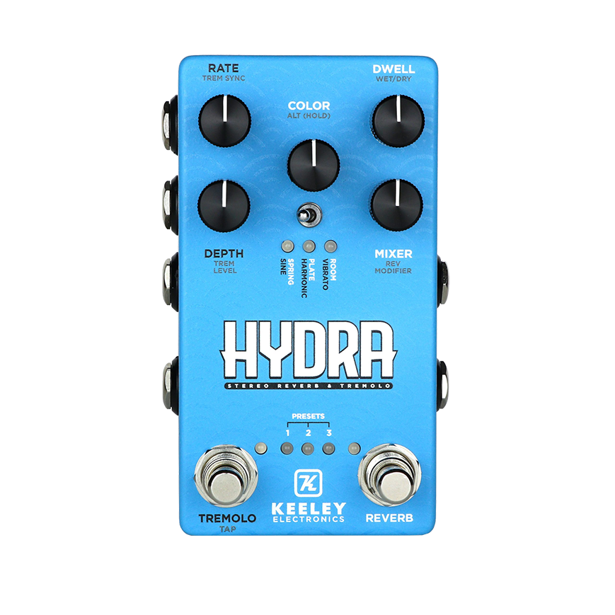 The HYDRA combines high-fidelity Reverb and Tremolo to add space and dimension to your guitar, bass, or keyboard signal. After the team at Keeley completed the ECCOS, we wanted to craft the perfect companion pedal, and we did just that with our new, feature-rich blue box.